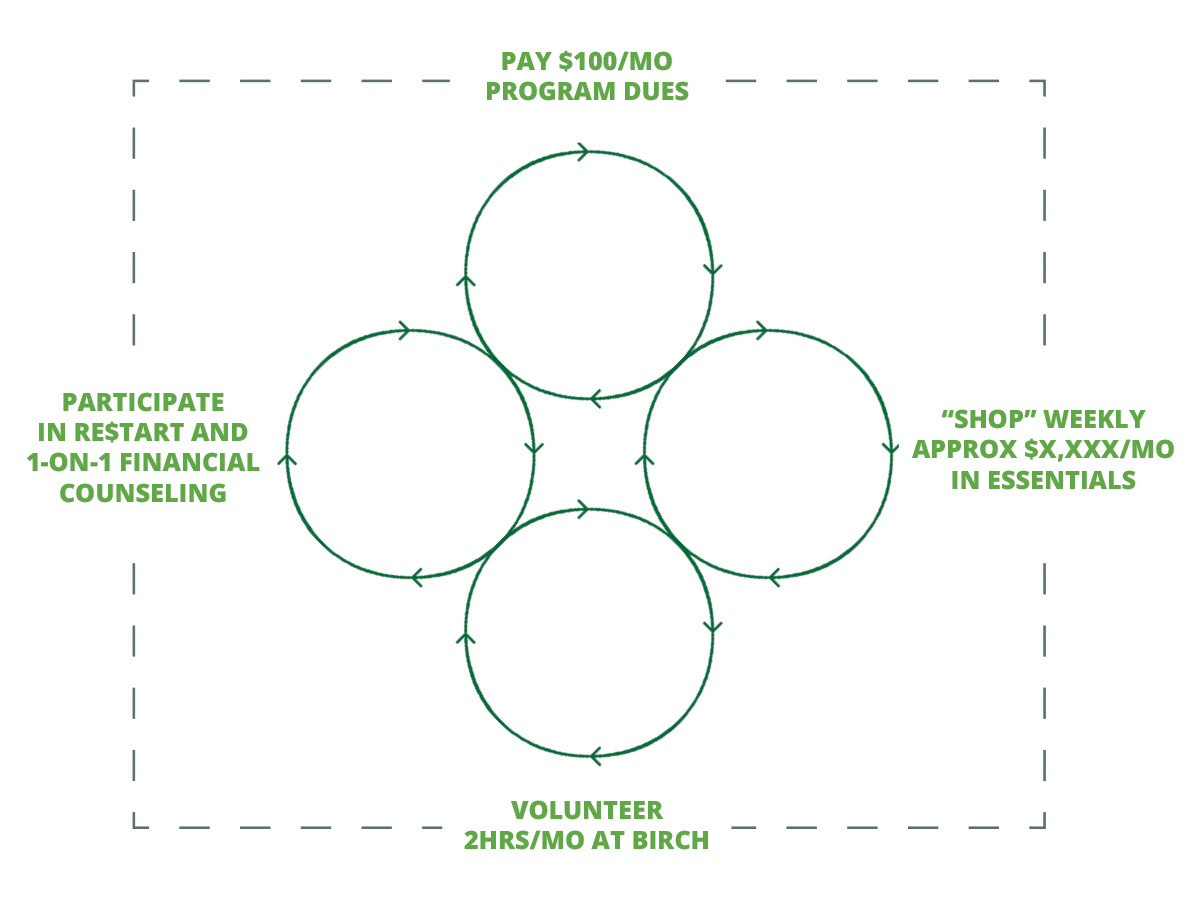 Families who join Birch commit to learning, community, and shared responsibility through monthly dues, volunteer service, financial counseling, and participation in re$tart, Birch’s foundational course on budgeting, credit, debt, savings, and goal-setting.